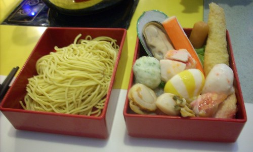 Little Sheep is styled after Mongolian hotpots, but Japanese hotpots are increasingly gaining in popularity here. Also known as shabu-shabu (Japanese for ‘swish swish’ to describe the sound of stirring stuff in the pot) or suriyaki, the two restaurants I’ve tried offered buffets rather than set platters (see above), with the hotpot a saucepan brewing on an electric hob in the centre of your table where you control the heat (see below), rather than the huge metal vat boiling away at Little Sheep. Given the cost of all-you-can-eat, plus side platters of fatty beef/pork, the choice and quality of ingredients is a little lower. Cocktail sausages, fish balls, leafy veggies and different kinds of bean curd, mushrooms and noodles are the main players. You also get a sauce bar (see above), where you fill a dish with whatever condiments you choose, most notably chilli, garlic and spring onions (and you can never go wrong with extra soya, right?) to dip your food in after cooking. Although I saw one person chucking their dishes of sauce into their hotpot, so anything goes. There is also a time limit, normally of an hour at lunch, 90 minutes at dinner.
