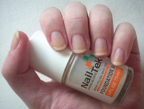 Why? Well if you can bear clicking the photos for enlargements of my battered hands, you’ll see that what, from far away, looks like a nicely neutral nail-elongating shade is actually, up close, a streaky ‘big old mess’.