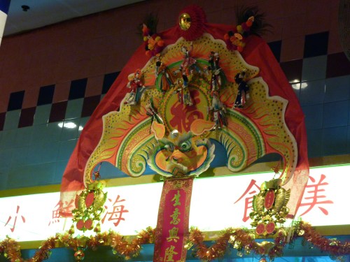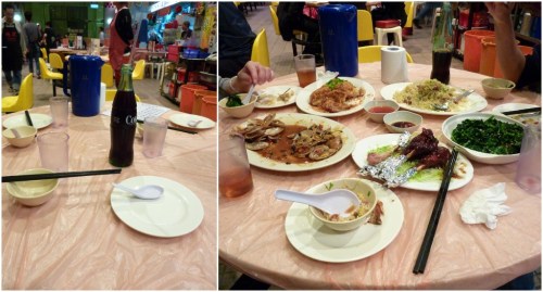 No-frills doesn’t quite do the place justice. Fans of soft furnishings look away now. Fold-up tables covered with bin liners, plastic stools to sit on, a roll of toilet paper on each table. The tiled floor is invariably wet (this is the wet market after all), the kitchens come complete with crates of fresh (as in still swimming) seafood stacked outside them and if you know what’s best, you wash all your (plastic) cutlery and crockery with tea that comes in a Blue Girl-branded jug. There is simply no equivalent in modern Western dining and I wouldn’t have it any other way.