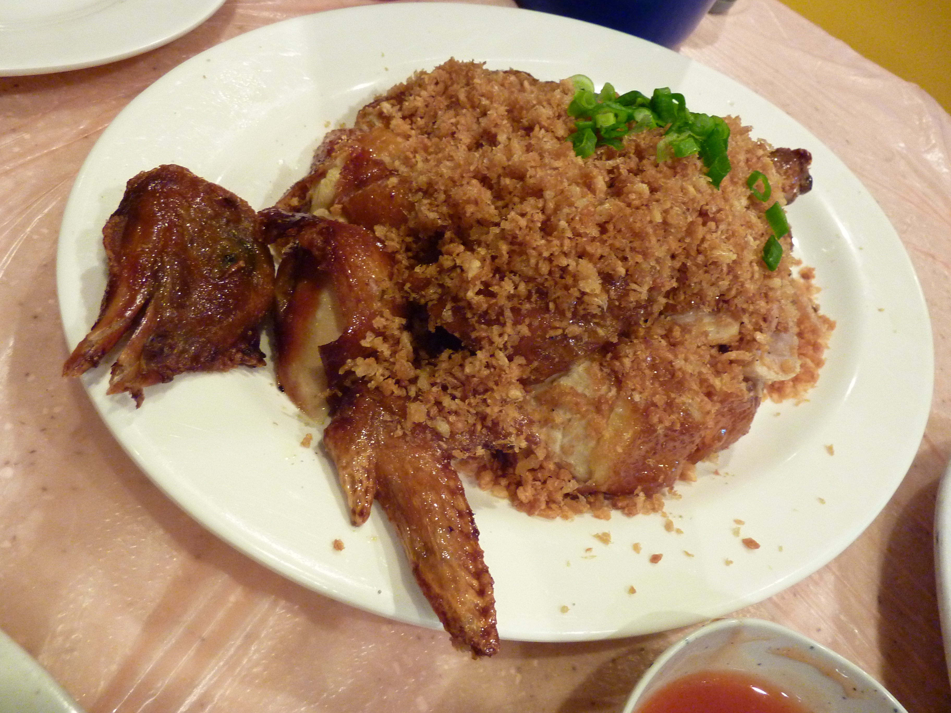 [For those interested, I’ve also tried their char siu pork (skin not crispy enough, meat not tasty enough, too fatty), a sweet and sour fish thing that was lovely with a sauce I could happily drown in, huge slices of beef that are impossible to chow down on (MSG overload and I simply don’t like that strange red sweet/sour/salty sauce that waiters keep telling me Westerners go gaga for) and deep-fried prawn cakes, which would have been awesome were it not for the fountains of mayonnaise that sprang forth from the middle (I’ve discovered this is a general hazard of deep-fried prawn things in HK).]