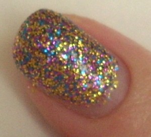 One of my previous objections to glitter polishes was that they tend to look like a pre-schooler ran riot in the art cupboard, with pots of glitter just dumped haphazardly on the nails. And Sparkle-licious looks pretty much exactly like that – the mixed-up multi-coloured bags of glitter you’re left with once kindergarten kids have got a bit too enthusiastic with your craft supplies. Although the bottle makes it look like purple might be the predominant colour, once it’s on the nails it seems to burst into a brighter golden glow. So whether you love it or loathe it, this look is a difficult one to ignore!