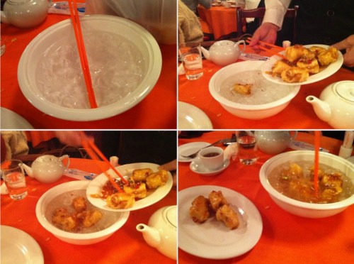 The must-have dessert is their banana fritters, which can also be found in most Chinese restaurants here and where the cooking process is almost as much fun as the eating! As with the plumes of smoke and raising of napkins that signal the arrival of the sizzling prawns, it’s all about the theatre. First comes a large bowl of ice cubes, then a plate of syrup coated segments of banana, with little slivers of cherry (not chilli as I’d alarmingly imagined!) clinging to the coating too. These are thrown into the ice, whereupon they snap crackle and pop with all the vigour of someone auditioning for a Rice Crispies advert. Then out they come – the Chinese equivalent of candy apples at the funfair, done with chopsticks throughout of course.