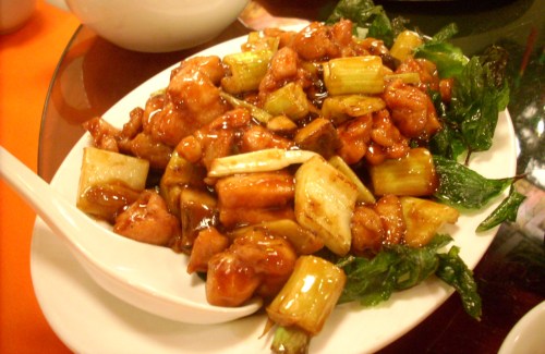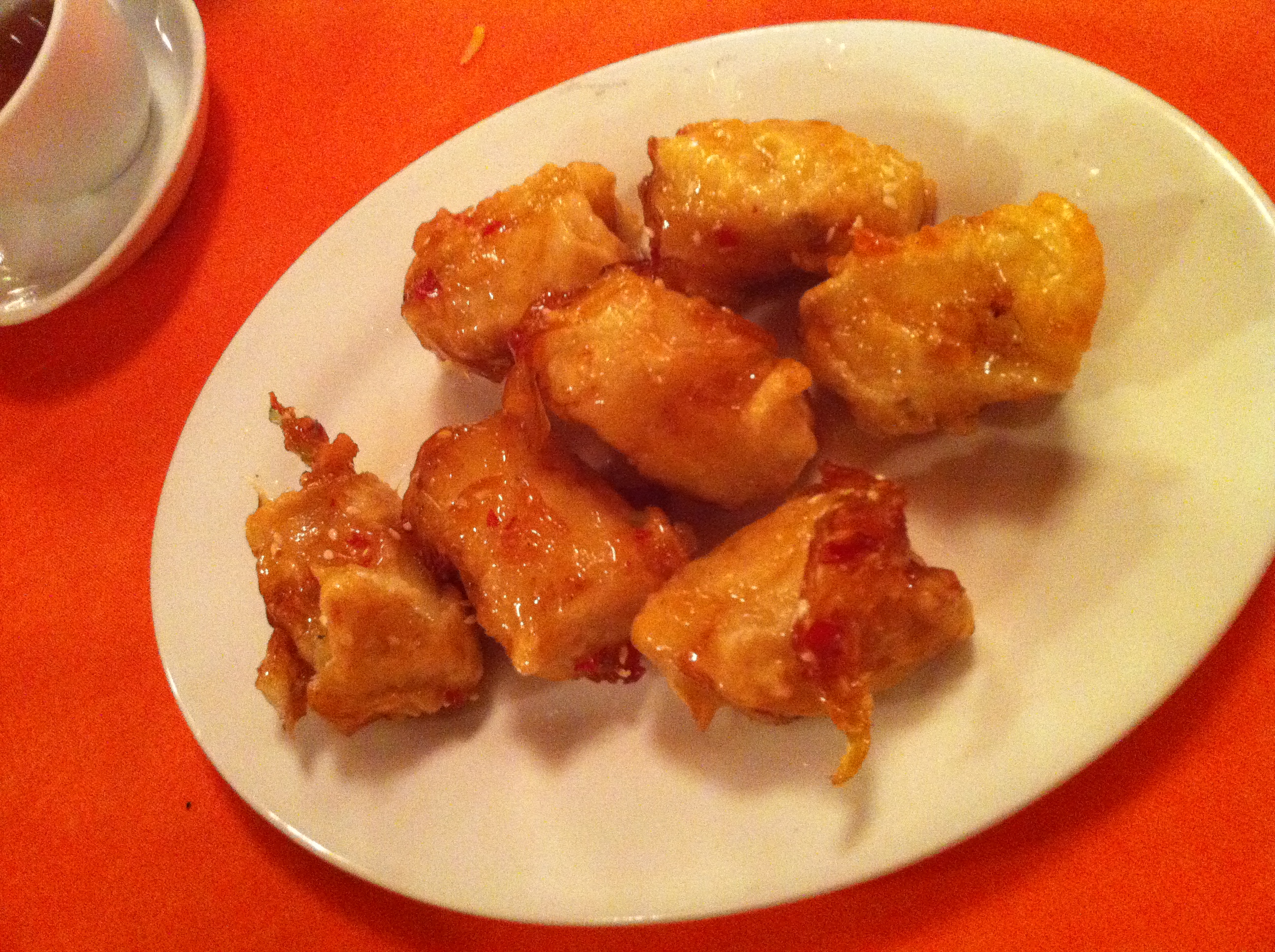 • I’m not a spicy person – I can’t stand Indian curries for instance – but I think this is do-able! The prawns are very much spicy-sweet combo and the heat builds the more sauce you shovel in! Chicken’s not really spicy at all, and there are lots of other dishes on the menu that aren’t if you need some stuff to balance it out, plus some Tsing Tao to wash it down! Anyway, you could always just order five plates of fritters instead 😛