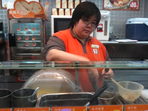 Some of the larger 7-Elevens have a hot food counter (or even a stand-alone hot food shop), serving up re-heated street food without having to go to the trouble of wandering around the streets for it. We’re talking curry fish balls, char siu bao, shao mai and strangely-shaped things on cocktail sticks, all washed down with an artificial food-colouring abundant slushie drink. There are even microwaves in-store to heat up the ready meals that are available.