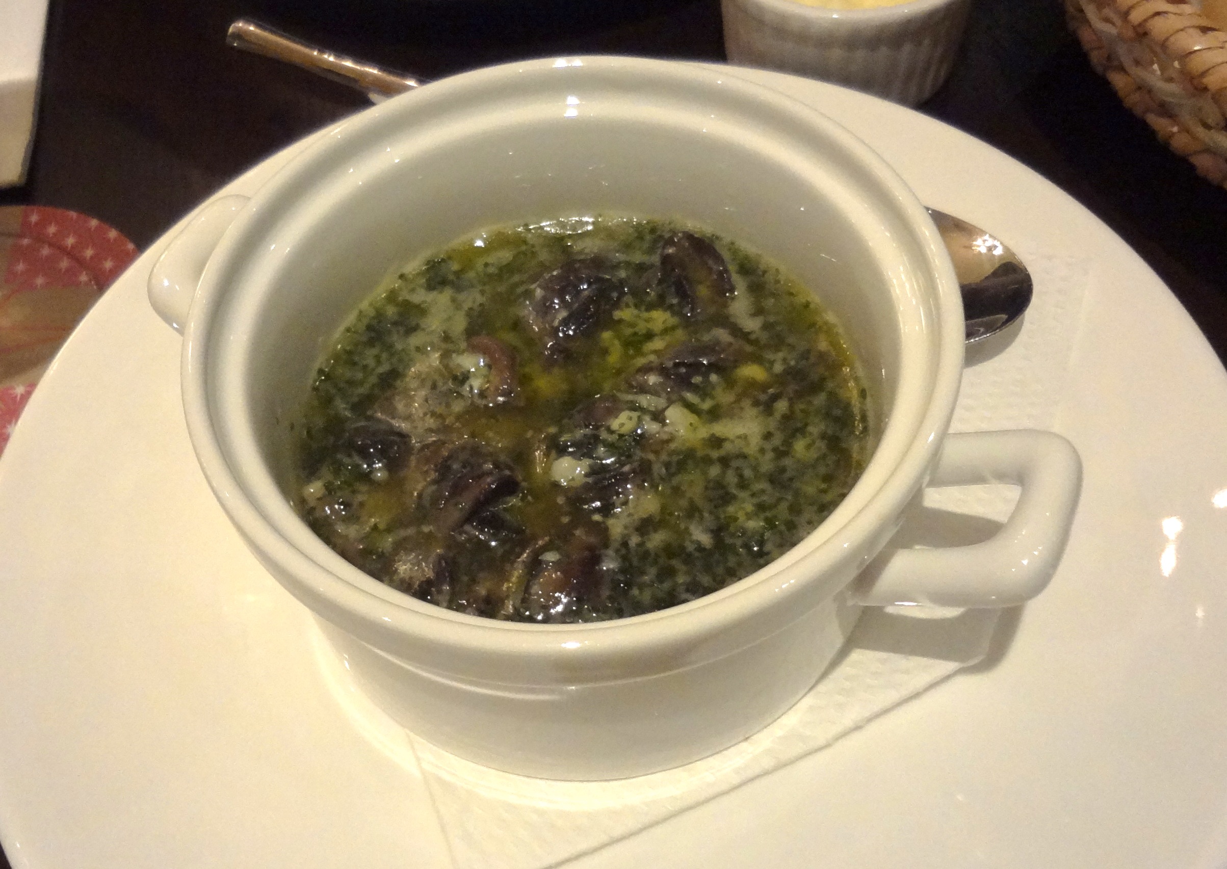 Then, we moved onto our starter – escargot with a garlic herb butter. Whenever I see escargot on a menu, however sketchy the joint (and I have had some truly sketchy escargots in HK, which the proprietors probably sourced from the back streets), I just have to have them. Brasserie de L’ile is a definitely non-sketchy joint and these escargots were absolutely mouth-wateringly delicious. Boyfriend had cautioned against having them (as he wanted to leave as much room for the fries as possible!) but these are worth making room for. However, not served in their shells and swimming in a pool of green sauce, I’ll admit it doesn’t make for the most appetising picture – but trust me, these are so good!