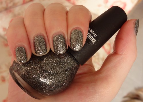 Nicole’s Nickel is a super-dense glitter, definitely far too dense for layering as a top coat if you’re that way inclined. It consists of a dark charcoal base with tonnes of silver micro glitter and bigger round silver pieces, packed in tight like glittery sardines. The effect of the dark base piled thick with so much differently sized shiny silver awesomeness gives a stunning depth and texture to the polish, like chunky chainmail for the nails. Meanwhile, the colour becomes an antique pewter gunmetal that sparkles at you even in the blackest of midnights – it’s gorgeous.