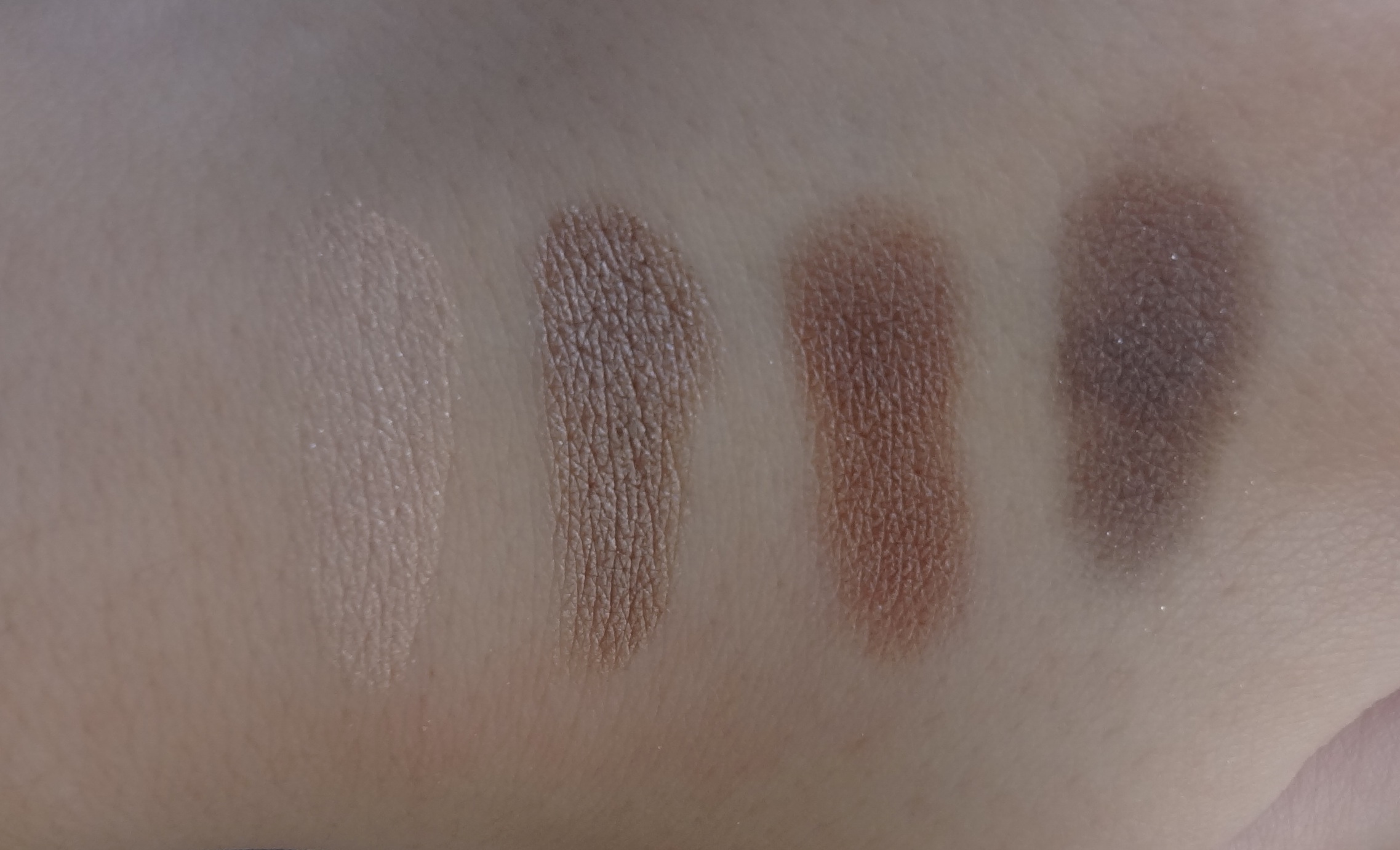 Anyway, the four shades are (left to right): Serendipitous, a shimmering champagne; Magnetism, a shimmery taupe; Fate, a warm-toned chestnut brown; and Apropos, a dark espresso brown with silver glitter. In short, they’re the ideal ingredients for creating a perfect smoky eye, whether for day or night!