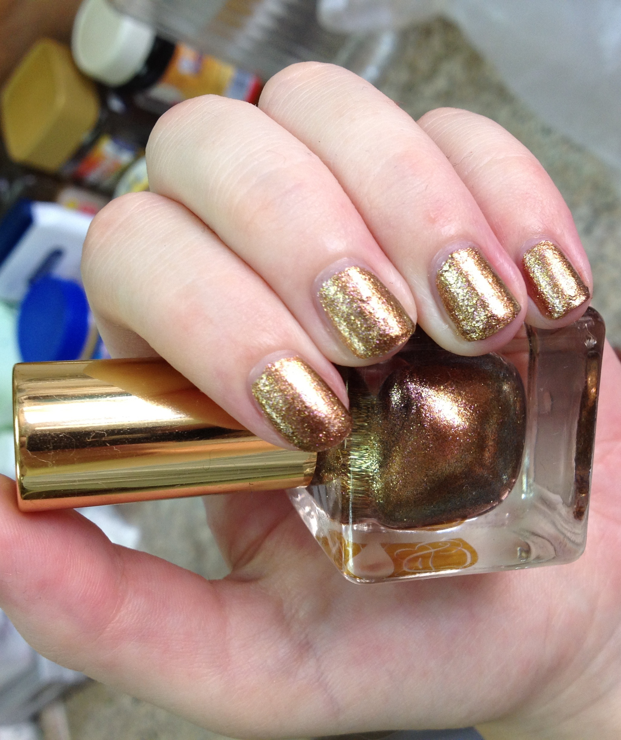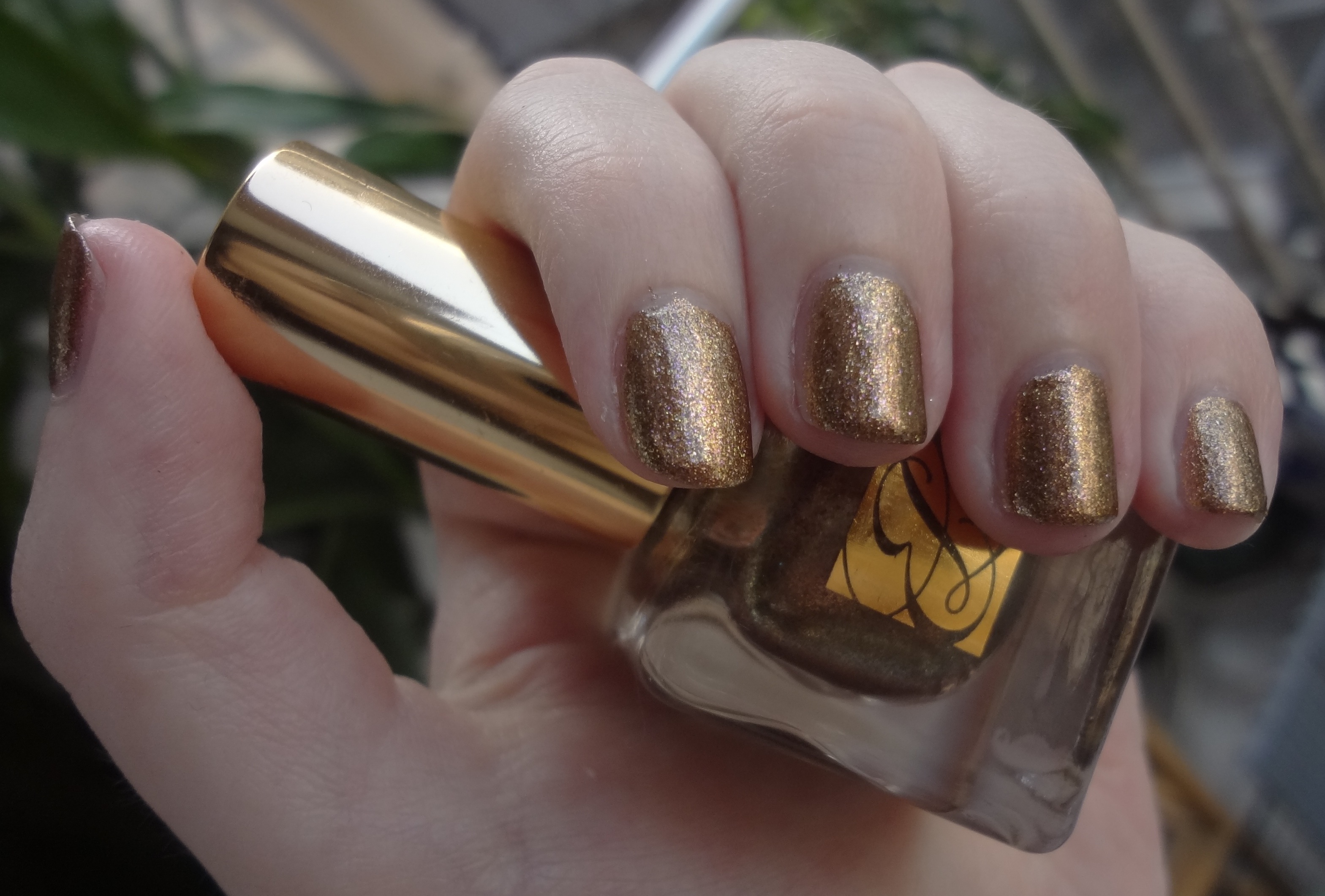 Nouveau Riche seems to straddle summer and autumn perfectly; it’s got the bright gold glitter of summer sunshine but paired with the bronze-y metallic embers of autumn. If you’re playing reasoning with your wallet, you could tell it that this is definitely one of those versatile colours that would go with anything at any time and anywhere, an investment nail polish if you like (well if we can have investment handbags then I’m going to go there!) – a touch of glam for the everyday or the perfect accent for a party.