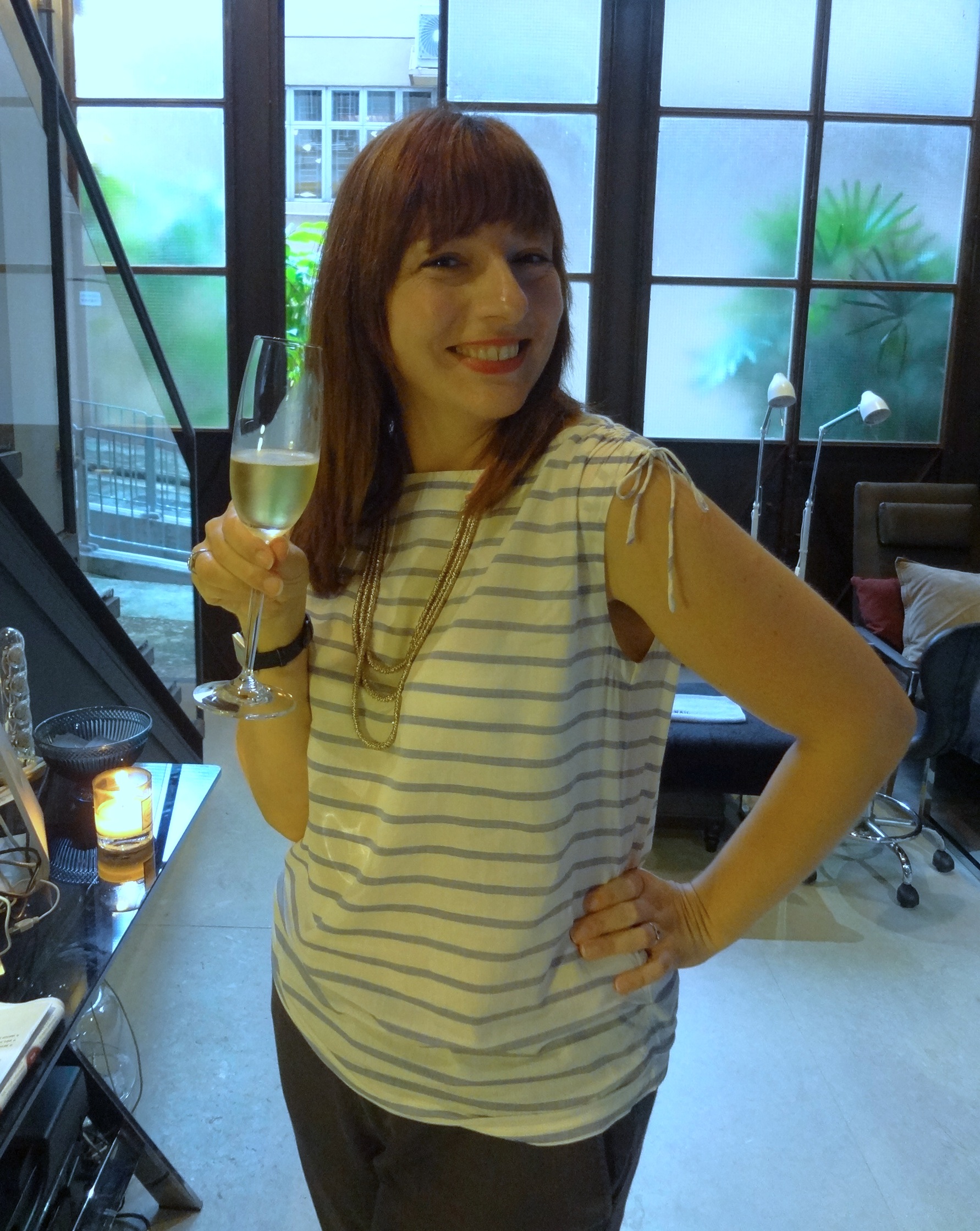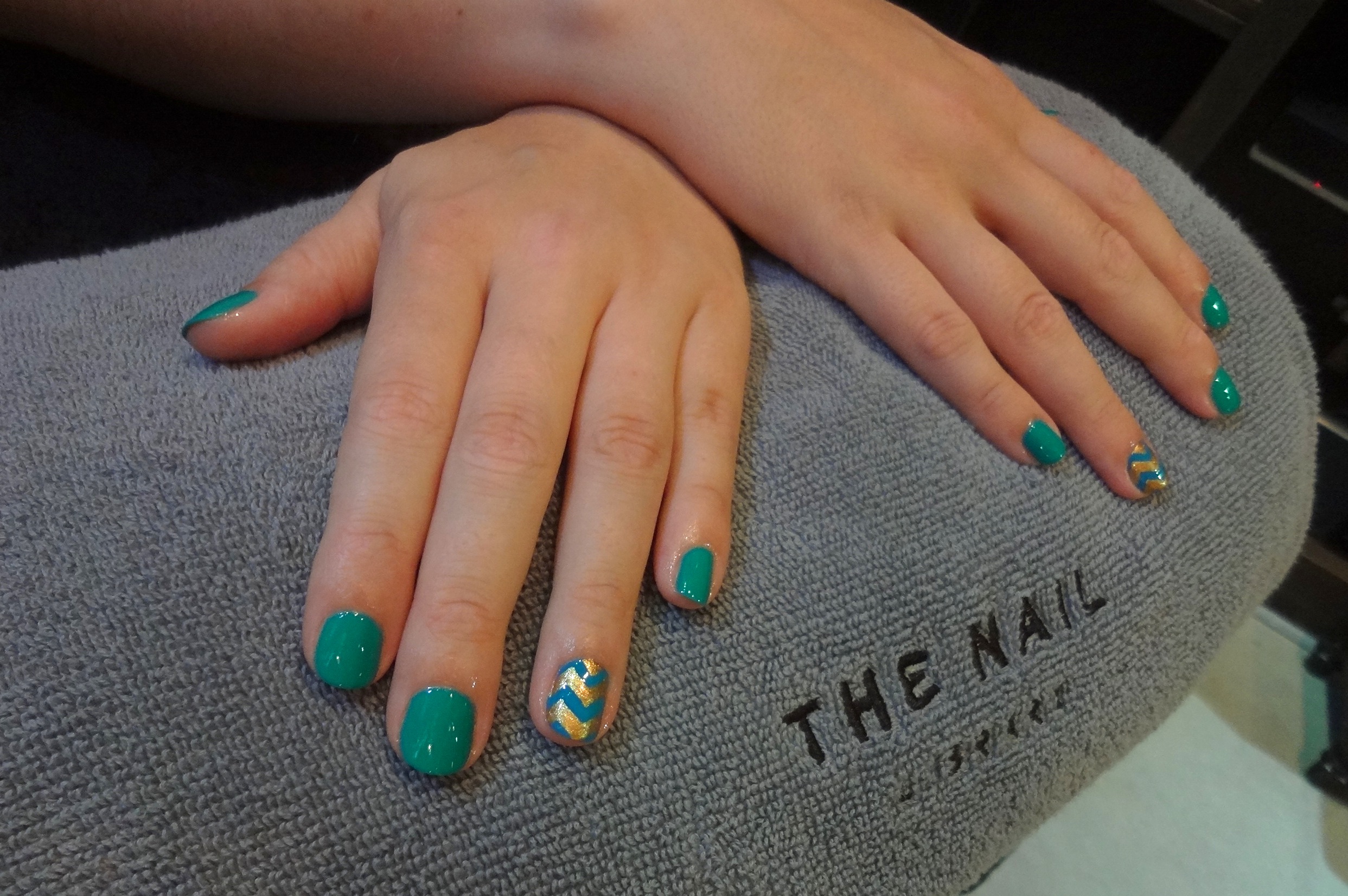 Meanwhile, I’d volunteered my friend Kate (seen above with de rigeur glass of bubbly) for The Nail Library Designer Collection Manicure and Panpuri Hand Spa Treatment. She was similarly treated to a wonderful hand and arm massage, much longer and more targeted than the usual generic mild stroking of hands. Ping had also mentioned that The Nail Library was hot on nail art so I put them to the test with a simple but striking design for Kate – a standard mani in Butter London Slapper (a stunning shiny teal), with an accent nail in Butter London Keks (a bright summer blue) with gold chevrons courtesy of Butter London Marbs (a beautifully even gold foil). Having seen the fantastic results and the painstaking care Kare’s therapist took over her nails, I knew I needed a piece of the action for myself and booked in for another mani session immediately!