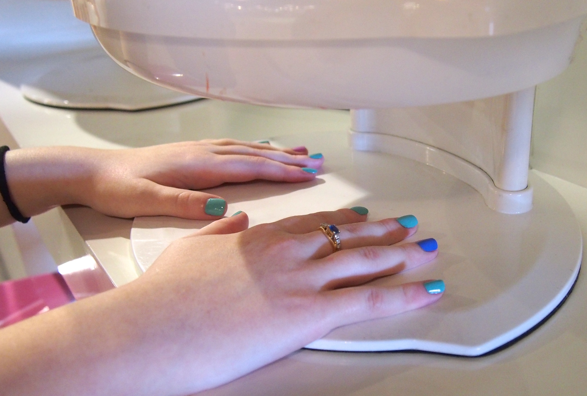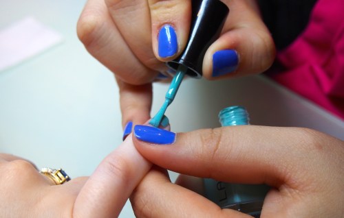 Honestly, the most time consuming part of the process may well be picking your polish poison! LAKA have over 150 colours in their nail lacquer line and I swear almost all of them are ready and waiting on display… think Joseph’s amazing technicolour dreamcoat and then some! After discussion with my much more stylish friend (and photographer for the day!) Karen, I eventually settled on some striking spring brights for my mani – awesome aqua on both hands, with accent nails of stunning cobalt blue on one hand and a cool pinky-purple on the other. It was kind of like the Clueless credits on my nails.